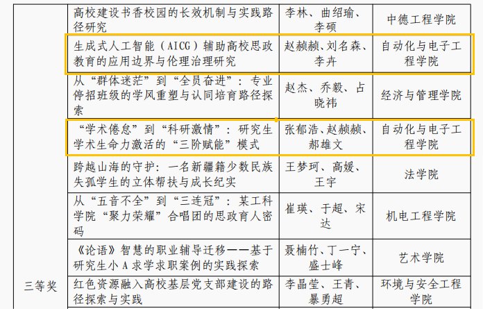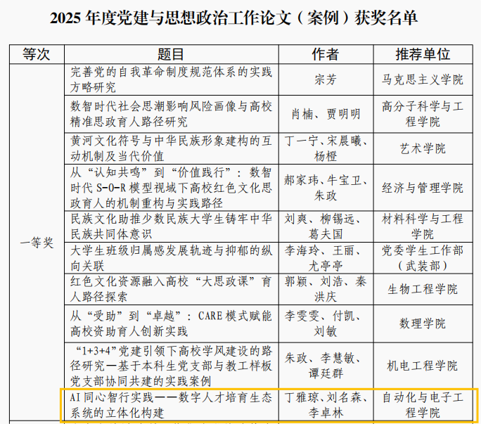 近年来,自动化学院始终坚持立德树人根本任务,将党建思政与学科特色深度融合,依托“智行先锋”党建工作品牌和“AI家驿站”学生社区建设,持续推动理论创新与实践探索。此次多项获奖,是学院党建思政研究的重要突破,彰显了师生团队的科研能力与育人担当。学院将以此为契机,不断深化研究、凝练成果,为学校高质量发展贡献更多智慧与力量。