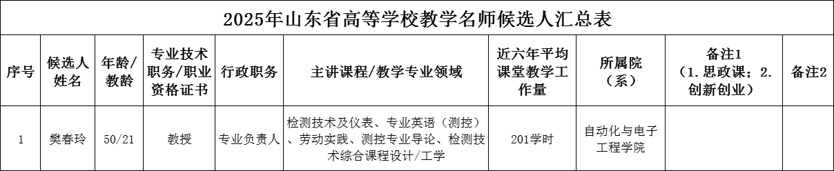 根据山东省教育厅《关于开展2025年山东省高等学校教学名师认定工作的通知》要求,学院组织符合条件的教师申报2025年山东省高校教学名师。经老师个人申报,学院进行审核,学院拟推荐樊春玲老师参加学校评选.