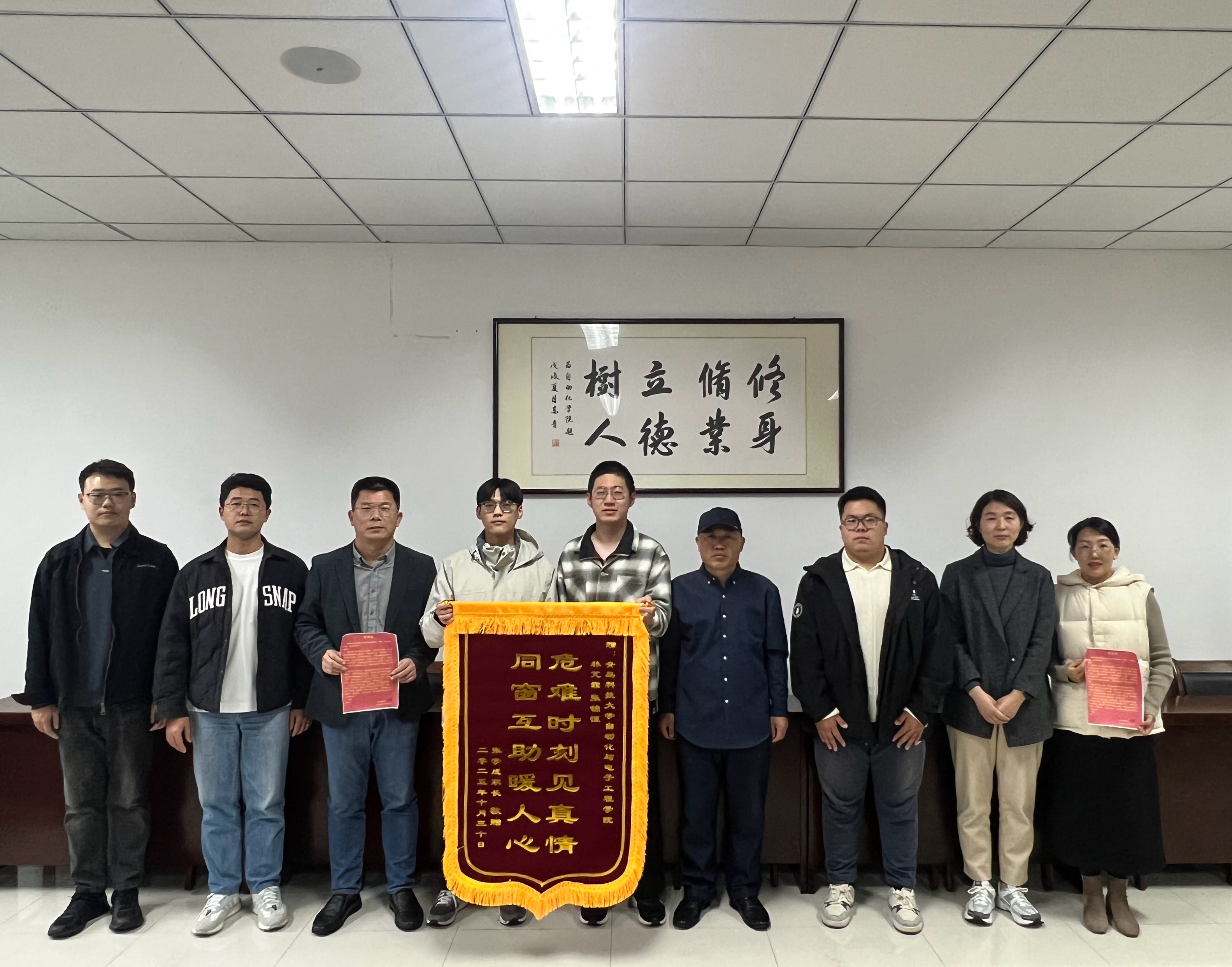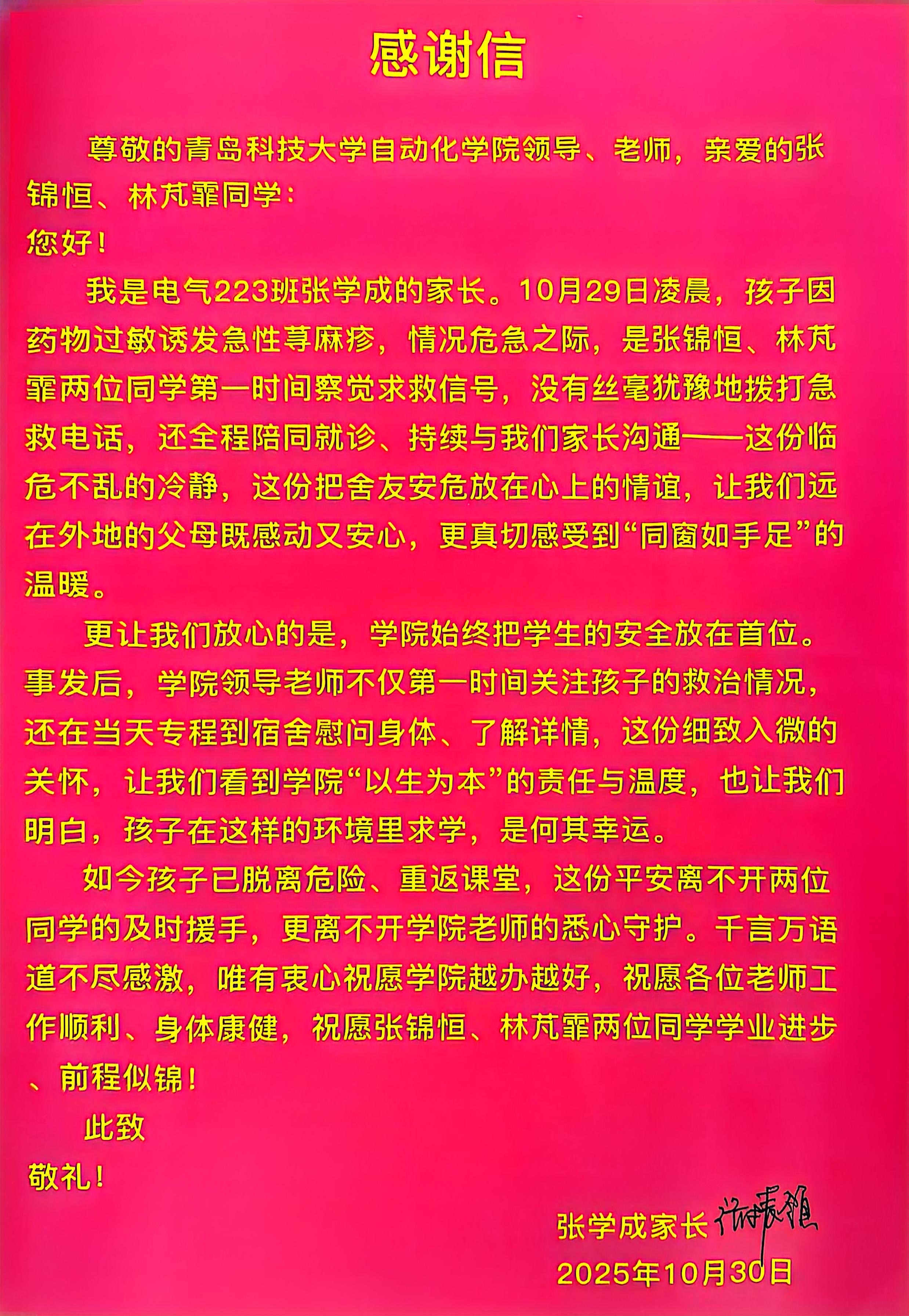 10月30日,自动化学院收到了一份来自广东湛江的特殊“礼物”——电气223班学生张学成的家长专程跨省而来,将一面印着“危难时刻见真情,同窗互助暖人心”的锦旗与感谢信,送到了电气223班学生张锦恒、林芃霏手中,以此感谢他们在深夜紧急救助突发急性荨麻疹的儿子,也向学院培育出有担当、有温度的青年学子表达由衷敬意。