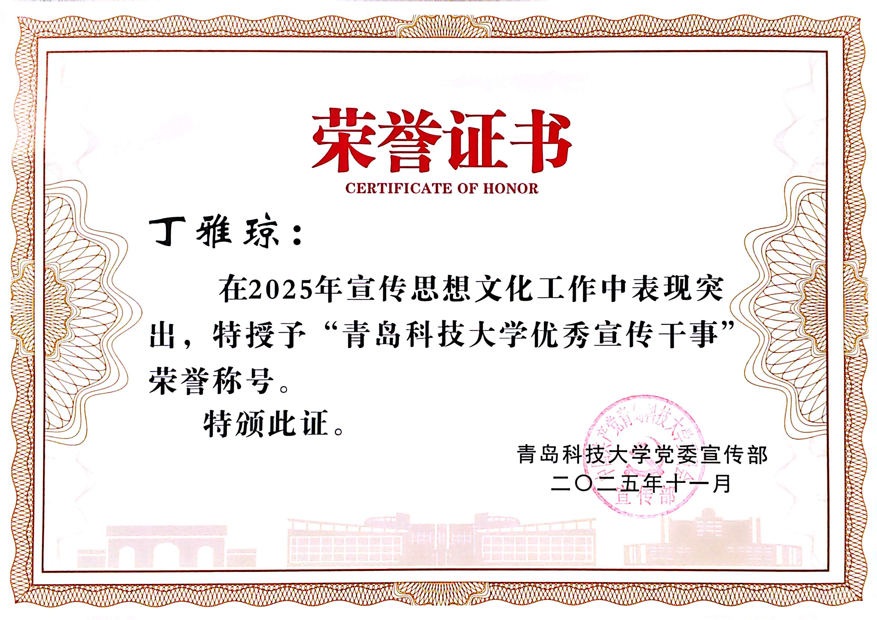 丁雅琼在2024-2025学年担任学院宣传干事,工作期间展现出极强的专业素养与责任担当。她不仅牵头策划了多项主题宣传活动,还悉心指导学生会宣传部,从选题构思到内容打磨全程跟进,培养了一批优秀宣传骨干。
