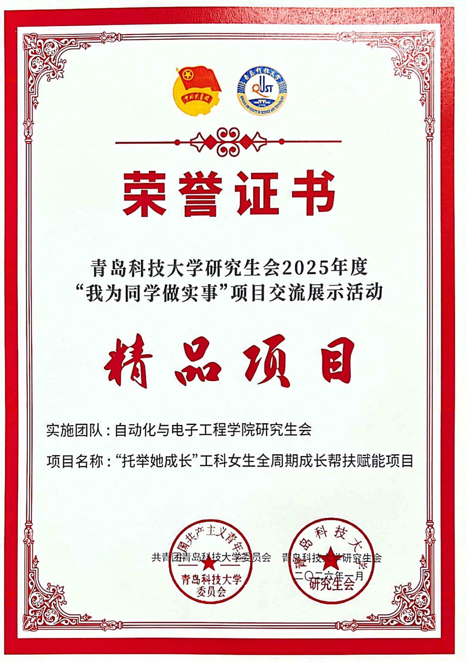 近日,青岛科技大学2025年度学生组织工作表彰结果揭晓,自动化与电子工程学院学生会获评“2025年度先进学生会”,学院研究生会“托举她成长”工科女生全周期成长帮扶赋能项目入选年度“我为同学做实事”精品项目,以两项荣誉彰显学院学生工作的扎实成效与创新活力。