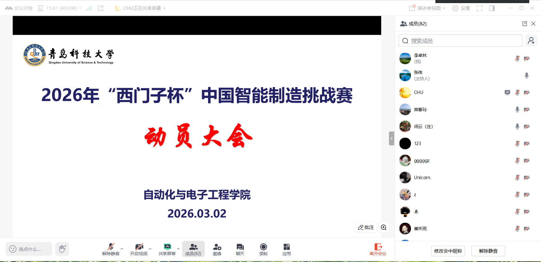 为深入贯彻落实《青岛科技大学关于做好2026年寒假学科竞赛备赛工作的通知》要求,充分利用寒假黄金时间提升学生创新实践能力与竞赛水平,自动化学院近日结合赛事特点,通过线上方式成功举行了“西门子杯”中国智能制造挑战赛动员大会及全国大学生电子设计竞赛培训讲座。此次活动旨在扎实推进2026年各类学科竞赛备赛工作,切实增加获奖数量、提高获奖质量。