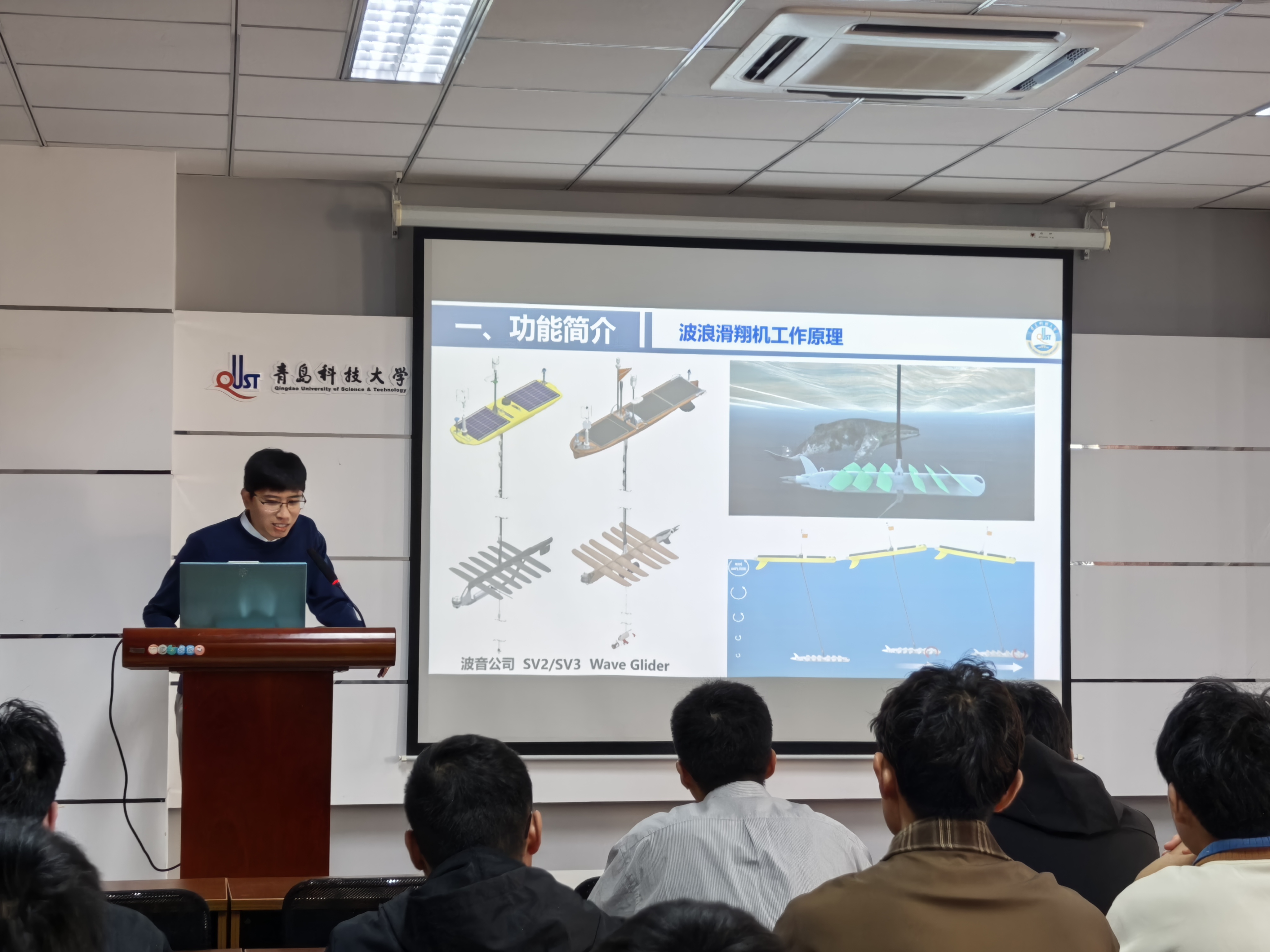 本次宣讲特邀于佩元老师主讲。他系统介绍了波浪滑翔机的基本工作原理与系统构成,并结合国内外典型应用案例,生动展示了该技术在海洋环境监测与观测领域的实际价值与广阔前景。报告内容深入浅出,既有对技术原理的清晰阐释,也有对应用场景的直观呈现,引导同学们关注海洋科技前沿,思考自主创新在海洋强国建设中的重要意义。